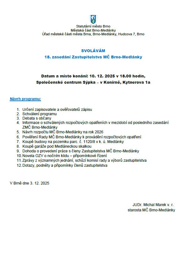 18. zasedání Zastupitelstva MČ - 10. 12. 2025 - Městská část Brno-Medlánky
